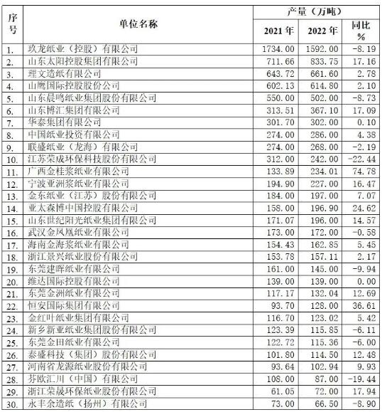 (2022年重点造纸企业产量前30名企业)