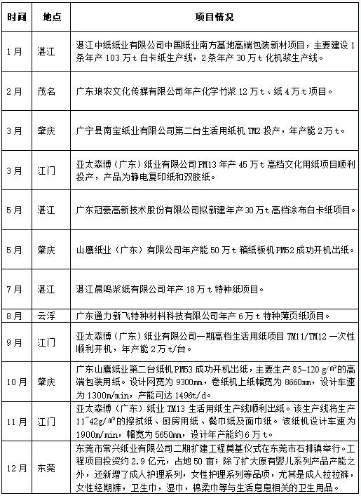 2022年,广东省造纸行业集中度进一步提升,大型现代化企业数量增加。广东省纸及纸板年产能超10万t的造纸企业共42家,其中100万t以上的企业有8家,分别是玖龙纸业(东莞)有限公司、广东理文造纸有限公司、东莞建晖纸业有限公司、东莞金洲纸业有限公司、东莞市金田纸业有限公司、亚太森博(广东)纸业有限公司、湛江晨鸣浆纸有限公司、山鹰纸业(广东)有限公司,其中广东山鹰纸业年产100万t包装用纸项目PM52和PM53属于2022年新投产项目,以2022年产量计算,除山广东鹰外纸业,其余7家企业总产量为1422.64万t,占广东省纸及纸板全年总产量的60%,广东山鹰纸业、广东亚太森博新项目全面投产后,该8家企业总产量占广东省总产量比例将进一步提高。另外,广东省年产能30万~100万t的企业有13家,10万~30万t的企业有22家。2022年广东省新增项目情况见表1。
