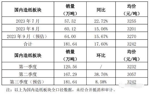 近期,造纸和纸制品业龙头纸企山鹰国际发布了第三季度国内造纸板块经营数据,经营情况环比改善。数据显示,山鹰国际8月份销量为60.12万吨,同比增长15.06%;预计9月份销量为64万吨,同比增长15.67%。一季度总销量为120.56万吨,二季度总销量为167.29万吨,环比增长38.76%;预计三季度销量为181.64万吨,预计环比增长8.58%。