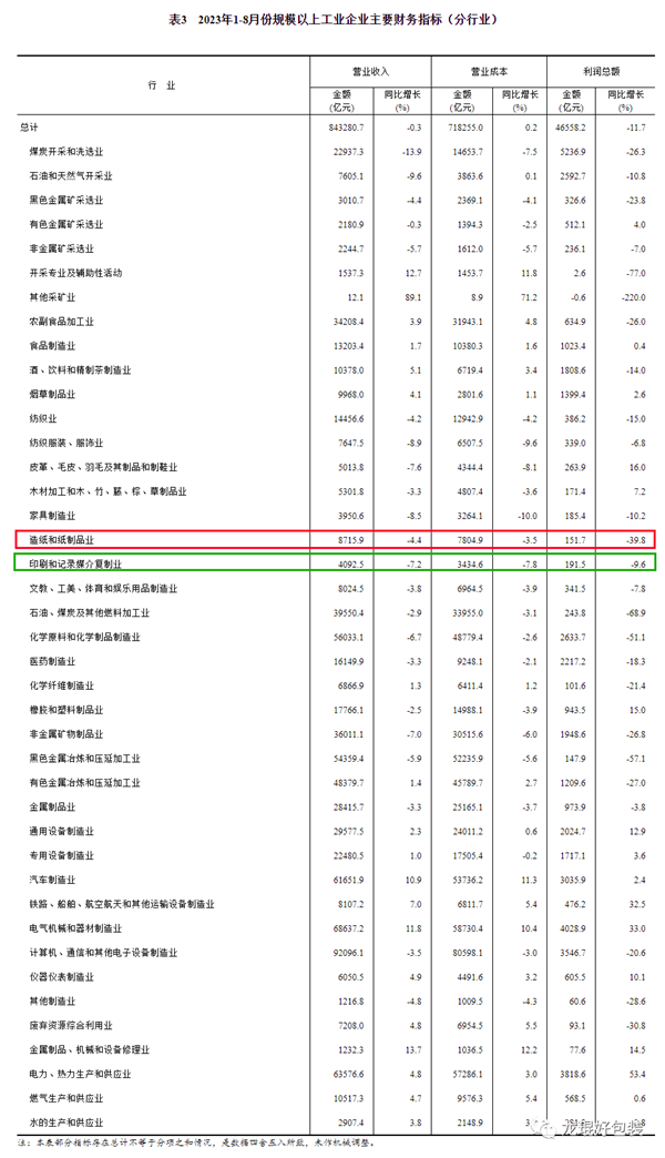 在41个工业大类行业中,造纸和纸制品业在1-8月份实现利润总额151.7亿元,同比下降39.8%;印刷和记录媒介复制业在1-8月份实现利润总额191.5亿元,同比下降9.6%。利润降幅较1-7月份均有所收窄。