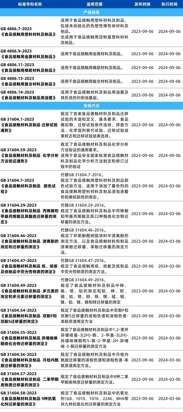 2023年9月25日,国家卫生健康委在官网发布2023年第6号公告,新发布85项食品安全国家标准和3个标准修改单,其中新发布的17项食品接触材料标准涉及塑料、复合材料、油墨、迁移通则、方法验证通则、特定迁移量检验方法等。