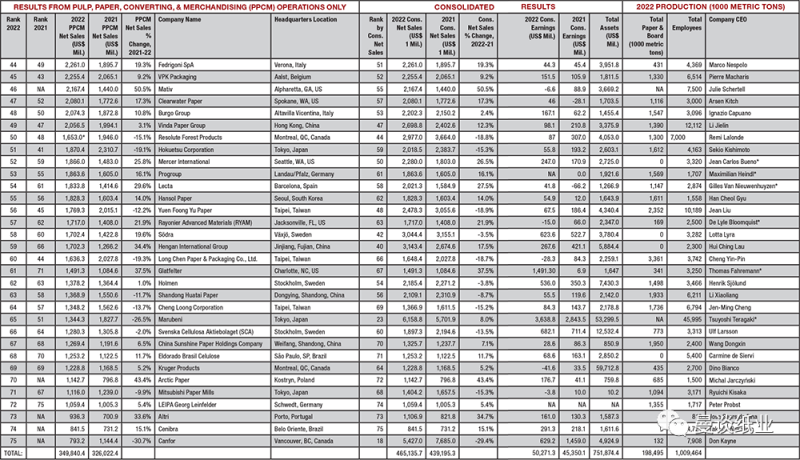 最新一期出版的美国paper360杂志根据2022年(部分企业为财年)企业纸浆、纸张、加工和贸易 (PPCM) 业务的净销售额为依据,公布了最新的全球纸业75强名单。