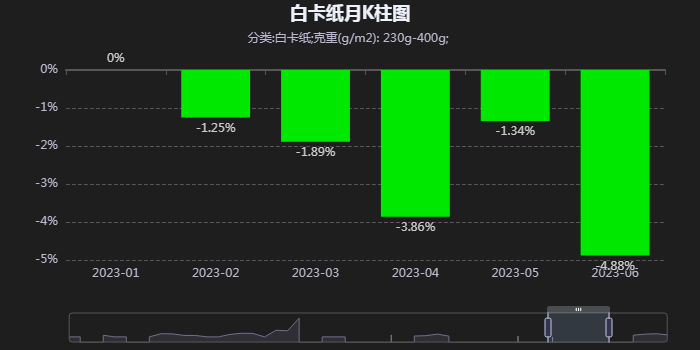 第一轮行情(1-6月):上半年白卡纸市场受供强需弱影响,价格不断下行,跌幅为12.59%。