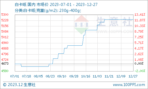 据生意社商品行情分析系统监测:2023年,白卡纸价格现降后涨,呈现“V”型走势。其中最高价格在1月为5346.67元/吨,随后价格不断下跌,7月11日迎来全年最低点,最低价格为4640元/吨,低点过后价格在迎上行,截至12月27日白卡纸国内230g-400g市场均价为5240元/吨,与1月1日市场均价相比下降2%。