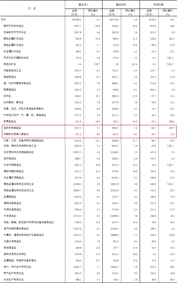 在41个工业大类行业中,造纸和纸制品业2024年1-2月份实现利润总额64.2亿元,同比增长336.7%;印刷和记录媒介复制业2024年1-2月份实现利润总额40.5亿元,同比增长57.0%。